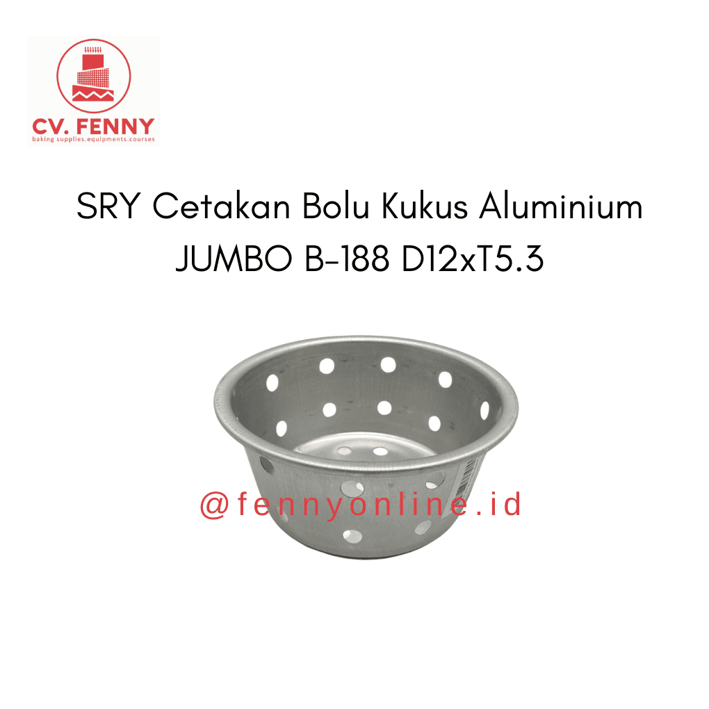 Cetakan bolu kukus aluminium B-188 JUMBO adalah alat yang digunakan untuk membentuk adonan kue bolu yang akan dipanggang menggunakan metode kukus. Cetakan ini terbuat dari aluminium, yang merupakan bahan yang baik dalam menahan panas dan mendistribusikannya secara merata ke seluruh permukaan adonan kue. Cetakan ini biasanya memiliki lubang-lubang kecil di bagian bawahnya untuk memungkinkan uap panas masuk dan memasak adonan dengan cara kukus.