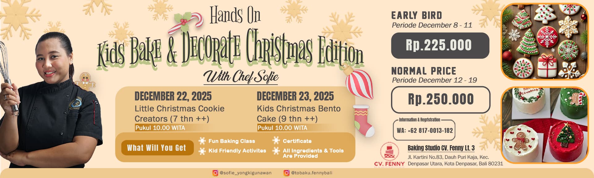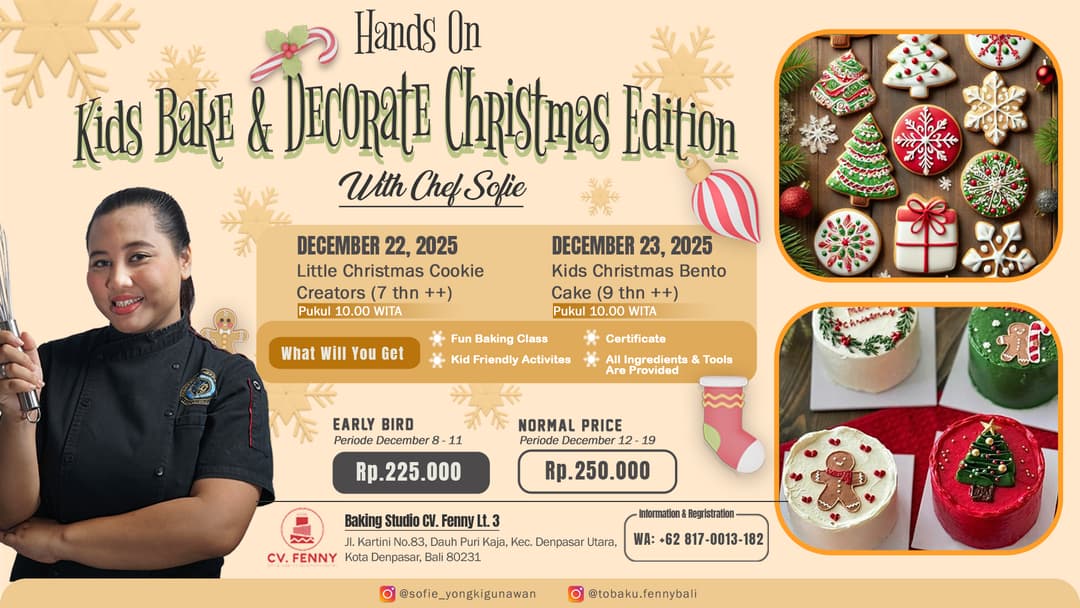 Liburan makin seru dengan kelas baking spesial Natal untuk si kecil! Dua sesi pilihan hadir di Baking Studio CV Fenny Lt. 3, dipandu langsung oleh Chef Sofie š„³